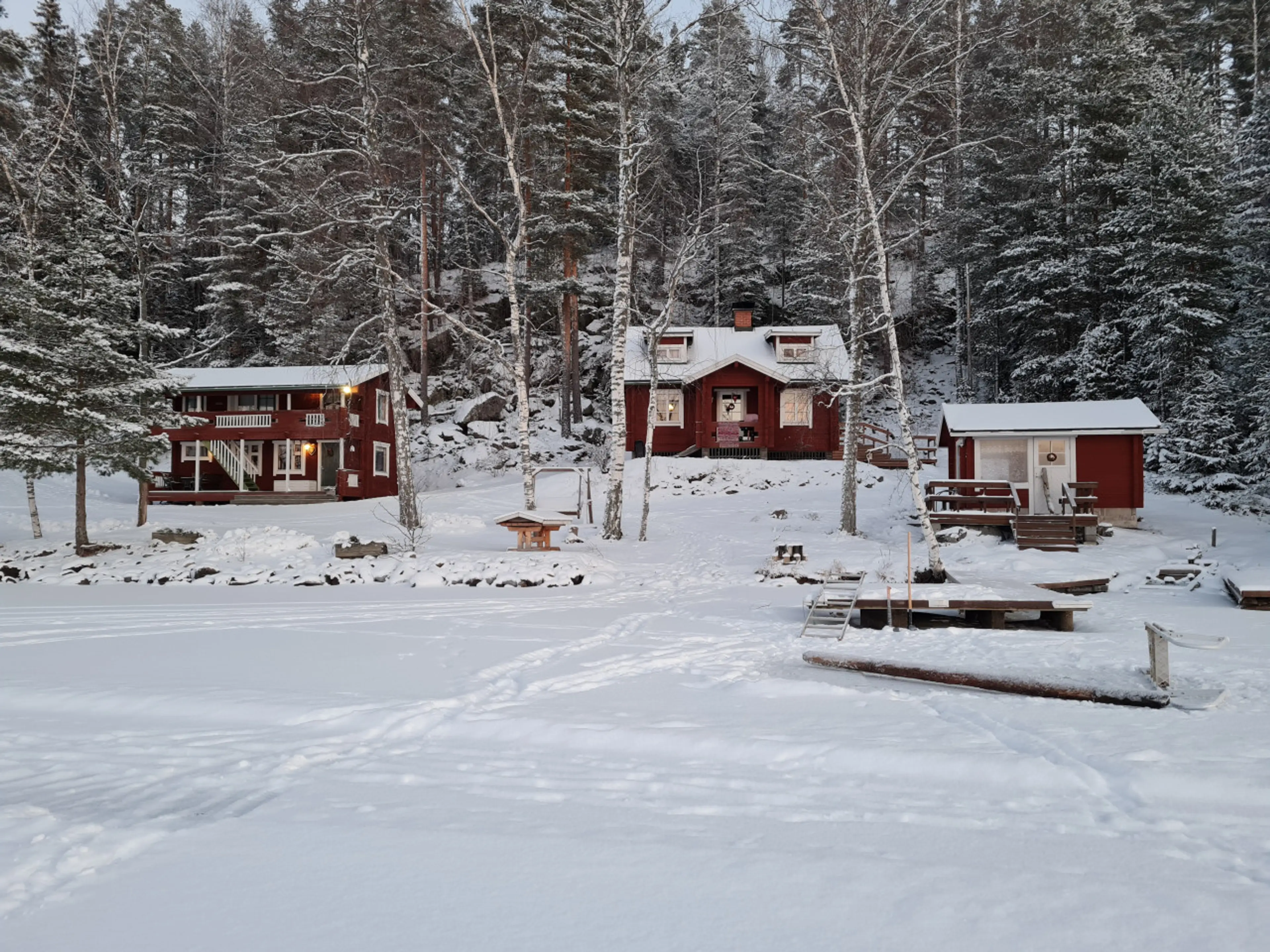 Positive: The cottages are in a perfect location if you want to get away from the world. The area is relatively quiet and isolated from people. Lots of beds between the two cottages - there were 6 (2 adults, 2 teenagers, and 2 kids) of us, and the place could have easily fit 4-6 more people. Many of the appliances were modern, the outhouse was clean, and drinkable water was provided. The beach featured beautiful sunsets, and the night sky was amazing! Lots of puzzles and games for the family, a lovely summer kitchen with a gas grill and a fire pit. Plenty of wood available, unlike some other places we've stayed. The wood sauna is also a nice feature, though it took us a bit to figure out how to get it hot enough for my husband's liking. The owners are also very friendly and helpful. If you are looking for a taste of the Finnish mökki experience with some modern conveniences, this is the perfect place. We had access to a boat so that we could have paddled around the lake, but didn't; however, this could be a good location for kayakers or canoers if you want to bring your own.