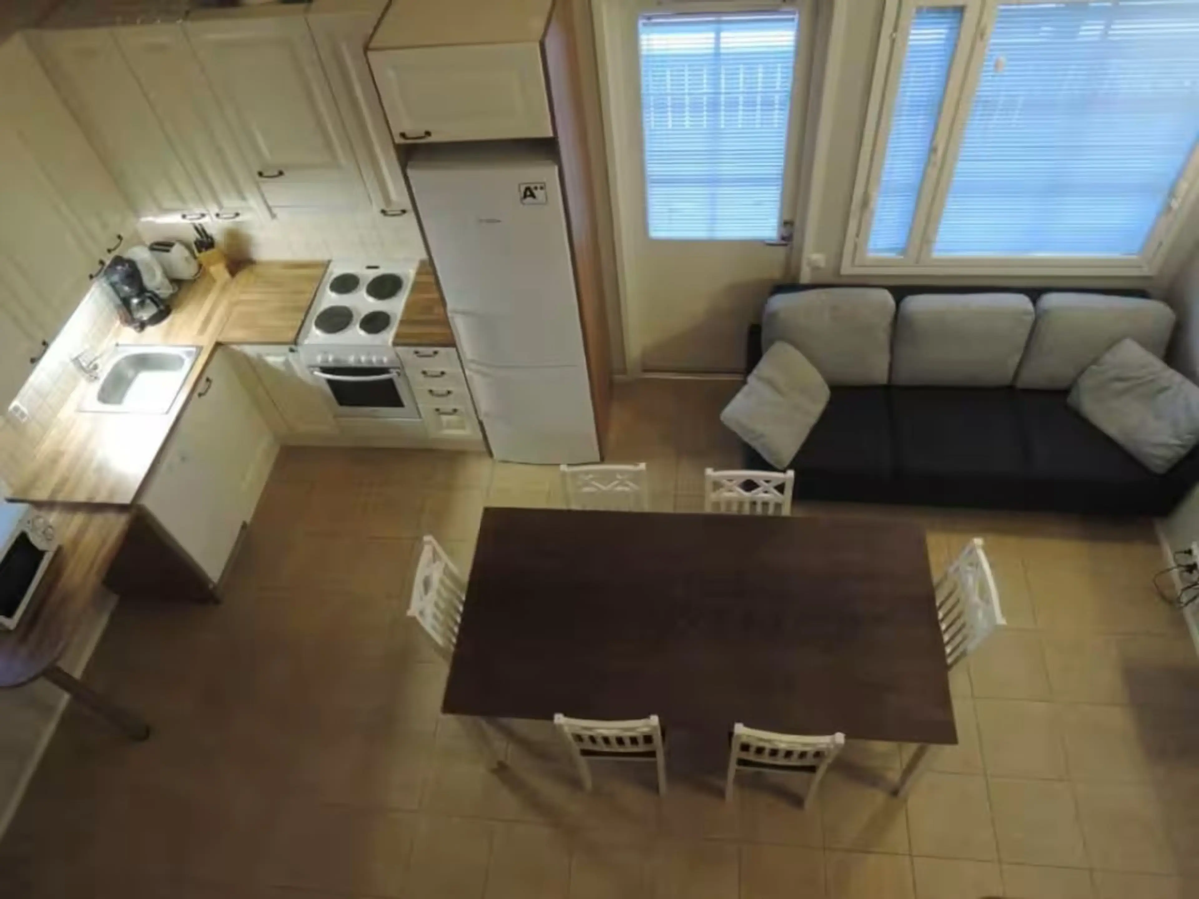 Negative: Olohuone keittiötila ahtaahko kuudelle ihmiselle, ei riittävästi sohvatilaa, vain yksi wc-kylpyhuone, jonka lattia kastuu kun joku käy suihkussa.